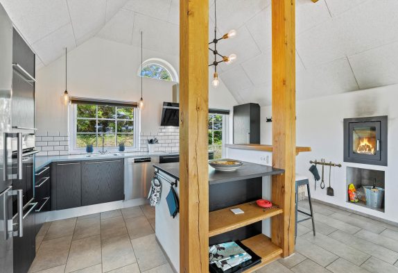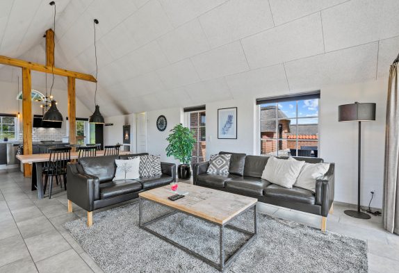 Midt i feriehuset er der lavet køkken, spiseafdeling og stue i et stort rum, så det er nemt for familien at samles, hvad enten det er over madlavningen, brætspil eller en god film. Og på grund af den energibesparende luft-til-vand varmepumpe kan I holde energiudgifterne nede.