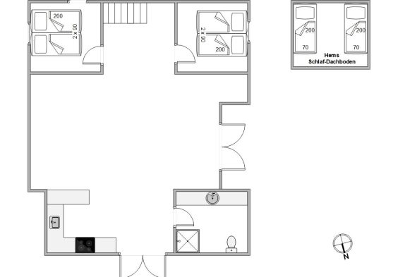 Den 122 m2 store lejlighed har loft til kip, den er dejlig lys og praktisk indrettet med 2 gode store soverum med dobbeltsenge og en fin, let tilgængelig hems med yderligere 2 sovepladser. I det moderne køkken er der induktionskomfur og naturligvis opvaskemaskine, ligesom I har både vaskemaskine og tørretumbler til jeres rådighed.