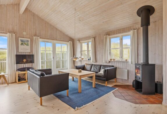 Badeværelset er udstyret med gulvvarme for en ekstra behagelig opvarmning, så I kan starte dagen på den bedst mulige måde. Brændeovnen i opholdsrummet skaber en hyggelig og intim atmosfære, hvor I kan tilbringe aftenerne med afslapning i varme og komfort.