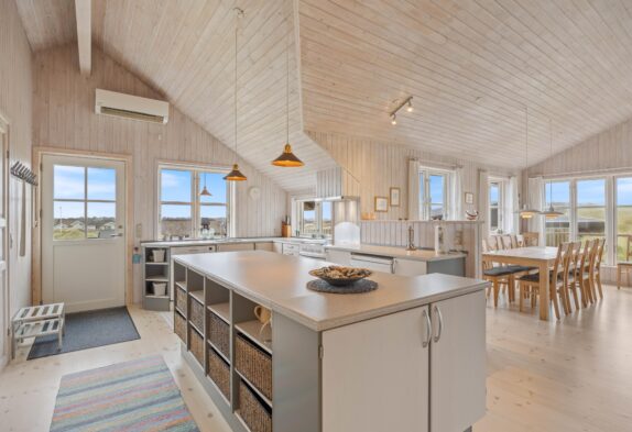 Feriehuset er hyggeligt indrettet og det er helt perfekt til en dejlig ferie med familien. I hjertet af sommerhuset har I køkkenet, spiseafdelingen og stuen i ét åbent rum. Fordi at der er lyst og højt til loftet, fremstår det rummeligt og indbydende, så I får lyst til at tilbringe mange timer med familien hér. Lad børnene hjælpe til med madlavningen eller saml familien omkring sjove brætspil eller planlægning af feriens udflugter.