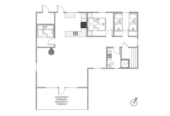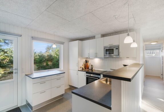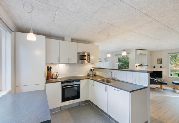 Sommerhuset er veludstyret med en række moderne faciliteter, der gør dit ophold både praktisk og behageligt. Køkkenet er flot og funktionelt, samt det ligger i åben forbindelse med stuen, så hele familien kan være samlet ved madlavningen. Hvis I elsker at lave mad, vil I helt sikkert sætte pris på det fuldt udstyrede køkken med opvaskemaskine, hvor du kan forberede lækre måltider med lokale råvarer. Direkte fra stuen er der udgang til en delvis overdækket terrasse, som vil være det naturlige samlingspunkt til grillaftenerne.