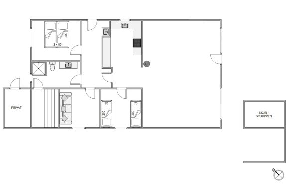 Feriehuset ligger på en lyngklædt naturgrund med en lukket terrasse og en carport. Det er det perfekte hus til en lille familie med hund, da det er godt indrettet og har praktiske overflader. Feriehuset ligger ikke langt fra Vesterhavet og tæt på det fredede hede- og klitareal mod vest.