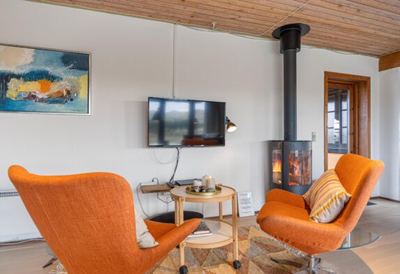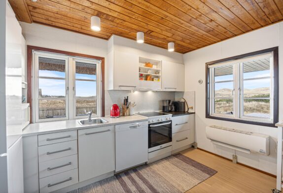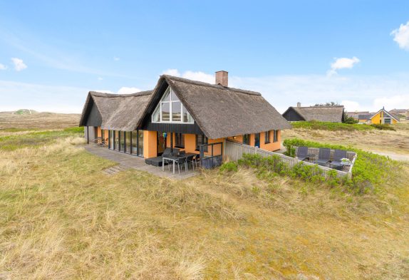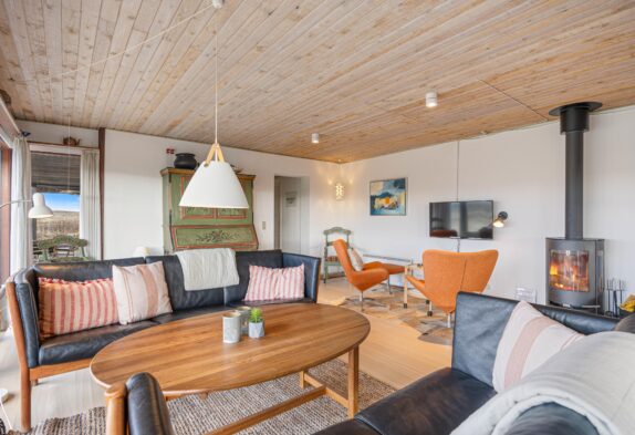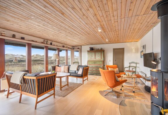 Dette personligt indrettede sommerhus i Skodbjerge er lyst og venligt indrettet, og her kan I føle jer godt tilpasse sammen. Her er helt perfekt til afslapning og til at få genopladet batterierne. Køkkenet er åbent i forbindelse med spiseafdeling og stuen, så I kan være sammen, uanset om I er på madholdet, spiller brætspil eller hygger jer i sofagruppen foran brændeovnen. Der er også en energibesparende varmepumpe. Fra alle rum i sommerhuset er der et fantastisk lysindfald og udsigt over det helt specielle klitlandskab.