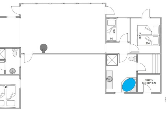 Udover egen wellnessafdeling med stort badeværelse, spa og sauna, indeholder feriehuset et ekstra badeværelse med brus, så I behøver ikke at stå i kø om morgenen. Der er barneseng til småbørnsfamilien. Soveværelserne har rigeligt med sengepladser og flere kombinationsmuligheder i forhold til at placere børn, voksne eller teenagere i gode værelser. Et værelse med køjesenge, som kan benyttes af børn eller voksne. Et rum med to dobbeltsenge til dem, som kræver meget plads, eller gerne vil sove flere sammen.
