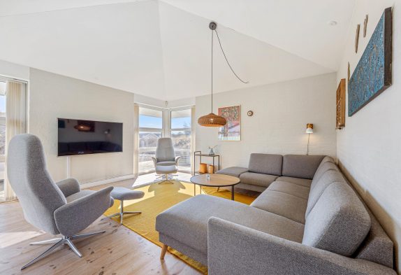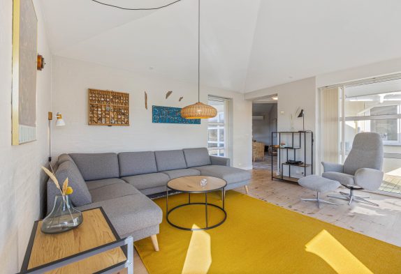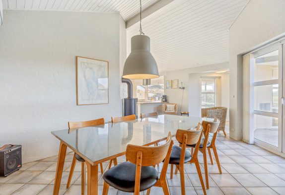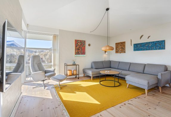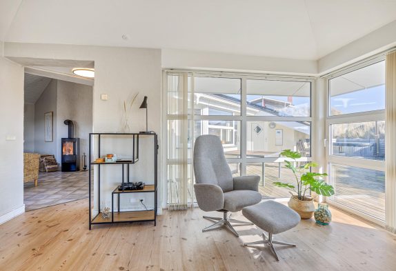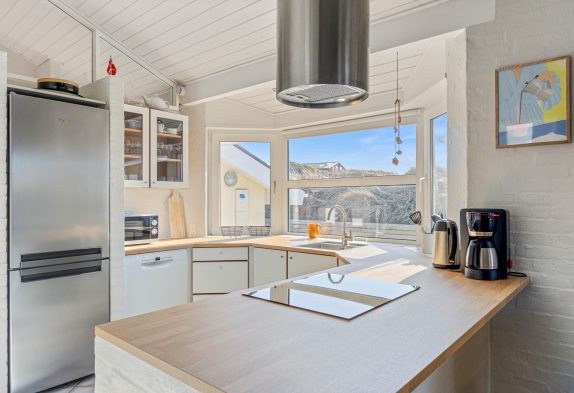 Der er et dejligt lyst og rummeligt køkken, hvor du kan lave lækkert feriemad eller tilbehør til grillbøfferne. Og i opholdsrummene er der lavet flere hyggekroge, så der er rig mulighed for at hygge sig med brætspil, en god film eller bare ren afslapning, hvor du kan nyde udsigten til naturgrunden og klitterne.