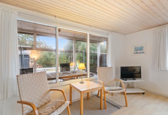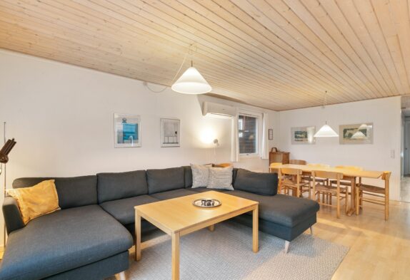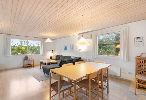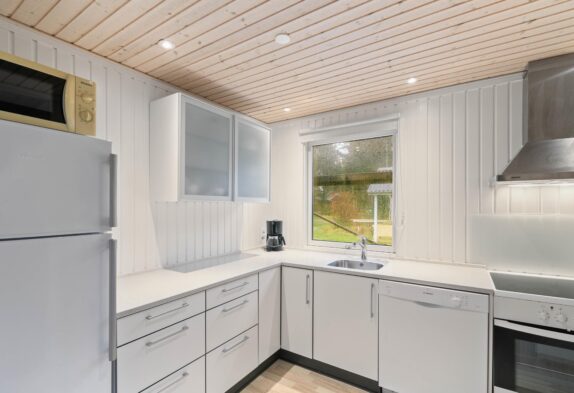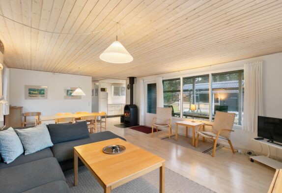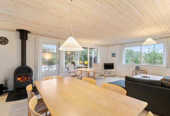 Husets hjerterum er helt sikkert det rummelige og hyggelige køkkenalrum, hvor I for alvor kan nyde kvalitetstid sammen med jeres nærmeste. Den hyggelige stue er udstyret med en brændeovn, som skaber en varm og indbydende atmosfære på kølige aftener. Desuden har sommerhuset en luft til luft varmepumpe, som sørger for et behageligt indeklima året rundt. Med gratis internet kan I holde jer opdaterede eller streame jeres yndlingsserier, lige når det passer jer. Indendørs er sommerhuset veludstyret med moderne bekvemmeligheder, som gør ferien behagelig og bekvem. I køkkenet finder I en opvaskemaskine og en separat fryser på 30 liter, så madlavningen og opbevaringen bliver let.