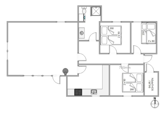 Samlet set består huset 78m2. Sommerhuset byder på tre hyggelige soverum, hvoraf to er udstyret med dobbeltsenge. Uanset om I kommer som familie eller venner, vil I finde sovepladserne bekvemme og afslappende. Det tredje soverum kan tilpasses jeres behov og sikrer en god nattesøvn til alle gæster. Med gulvvarme på badeværelset kan I glæde jer til en varm start på dagen, selv på kølige morgener.