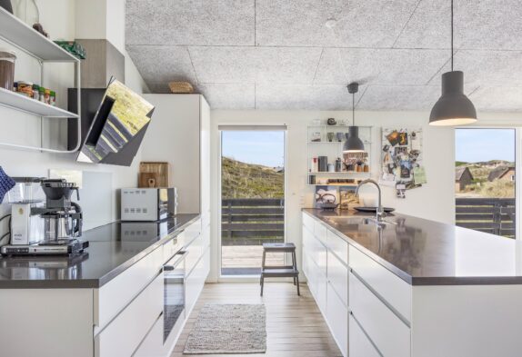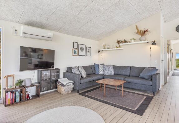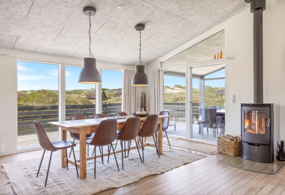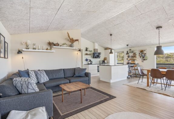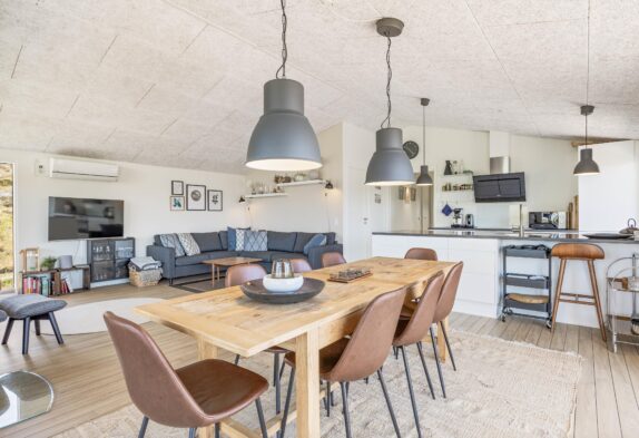 I feriehuset er der gjort meget ud af indretningen. Ikke kun for at få det til at fremstå så indbydende som muligt, men også for at det skal leve op til de forventninger og behov man som feriegæst kan have. I den ene ende af feriehuset har I et dejligt og stort åbent rum, hvor der er lavet både stue, spiseafdeling og køkken. Rummet er helt ideelt til ferien, da det sætter fokus på sammenvær og familiehygge.