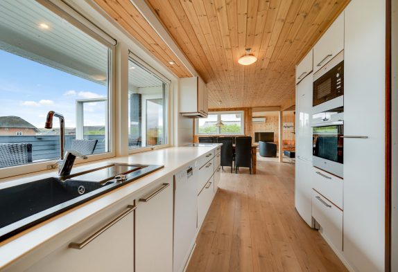 Køkkenet er i åben forbindelse med stuen, så det indbyder til fællesmadlavning og gode samtaler mens maden simrer.