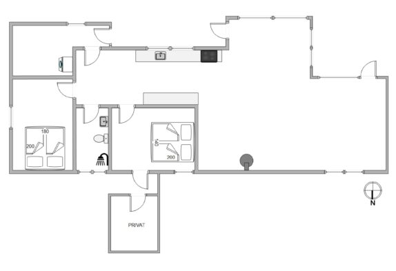 Ved feriehuset har du en dejlig sydvendt terrasse, hvor du kan nyde de gode solskinsdage og grillaftener – helt perfekt, når du bare vil slappe af og nyde den friske luft.