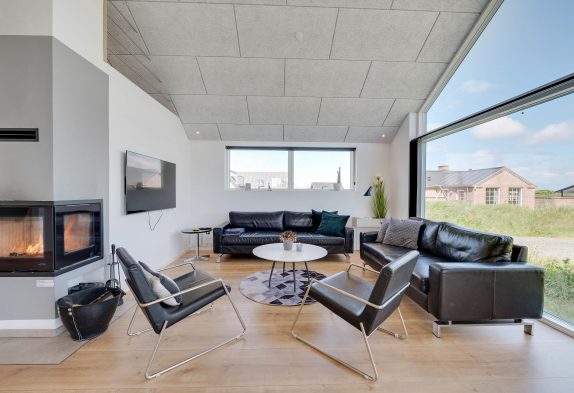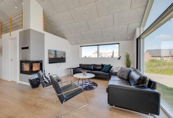 Moderne og rummelig indretning med brændeovn og aktivitetsrum