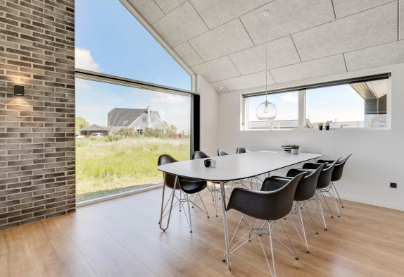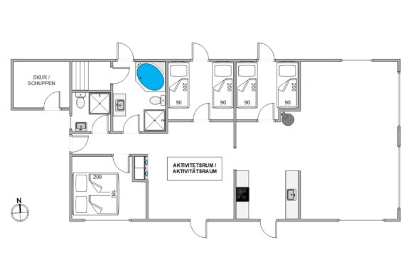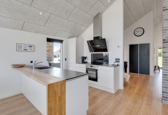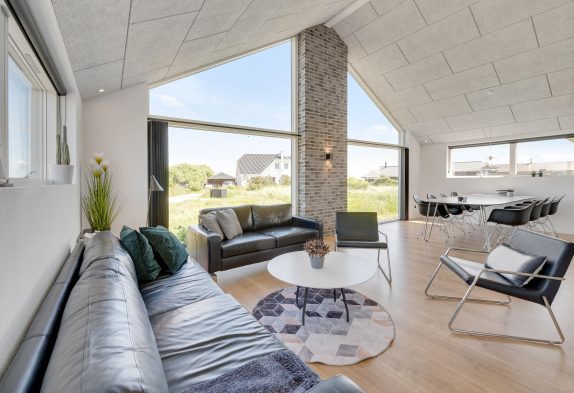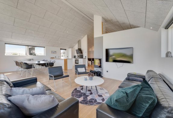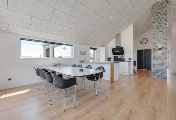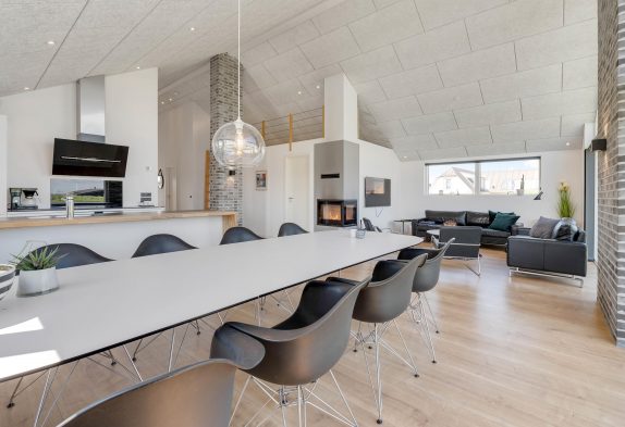 Sommerhusets hjerte er det åbne opholdsrum, som kombinerer køkken, spiseafdeling og stue i ét stort fællesrum. Her er der lagt op til mange skønne feriestunder i godt selskab – og den knitrende brændeovn sørger for, at der altid er en god varme såvel som en hyggelig feriestemning. I forlængelse af opholdsrummet ligger aktivitetsrummet, hvor I kan udfordre hinanden på kryds og tværs til et spil airhockey, ligesom børn og voksne kan hygge sig på hemsen.