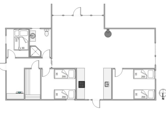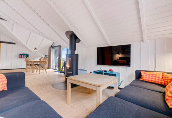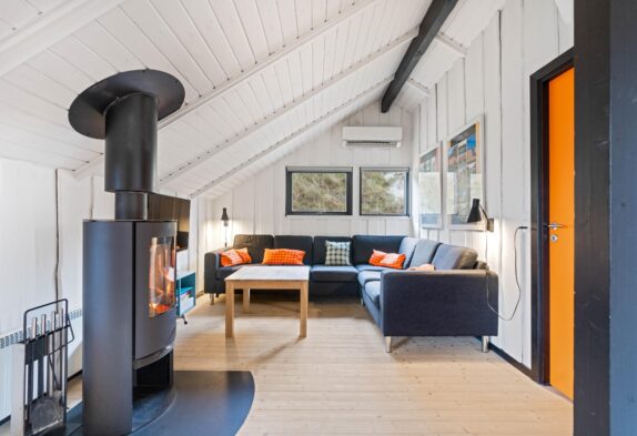 I sommerhusets hjerterum, det store opholdsrum hvor stue, køkken og spiseafdeling flyder sammen, kan I alle samles. Her står brændeovnen centralt placeret og skaber hygge samt en naturlig opdeling af rummet. Rundt om spisebordet kan I samles om lækre måltider, hyggelige brætspil eller planlægge morgendagens aktiviteter.