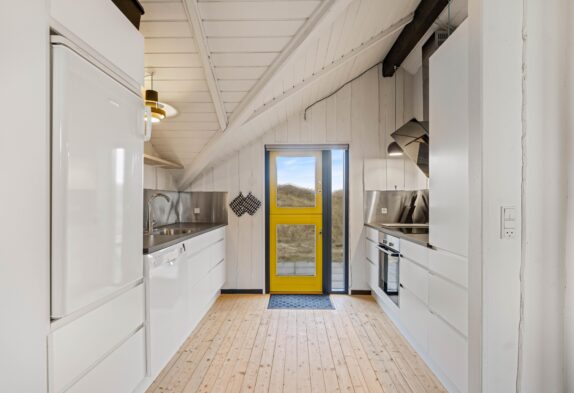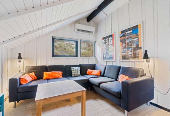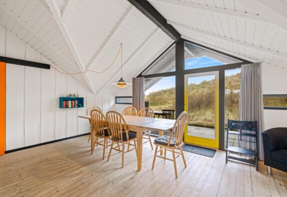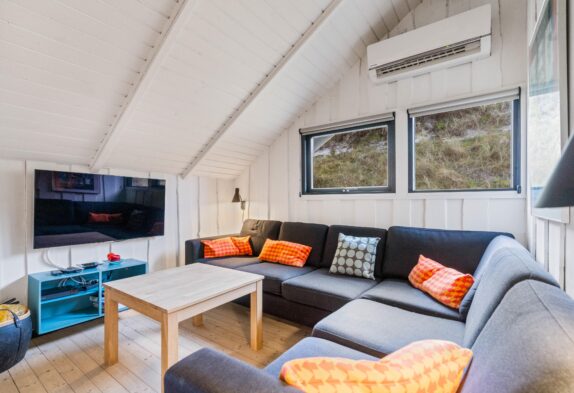 Her er et dejligt feriehus, der inviterer til afslapning og kvalitetstid med familien. Farverne er afdæmpet og de smukke hvide trælofter og gulve, bidrager til en harmonisk indretning. Feriehuset har plads til 6 feriegæster og har 3 gode soveværelser, hvoraf det ene er indrettet med en køjeseng – det bliver uden tvivl et højdepunkt for flokkens mindste.