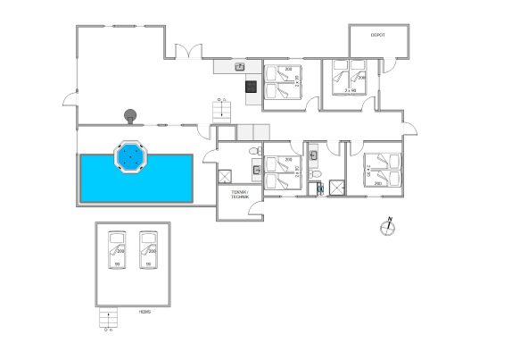I poolafdelingen findes der, ud over en dejlig pool, hvor man rigtig kan boltre sig, også spa og et badeværelse med bl.a. vaskemaskine og tørretumbler. Der er adgang til poolområdet fra opholdsstuen med en dobbelt glasdør. Igennem de store glaspartier fra spisestuen kan I holde øje med børnene og nyde deres leg i pool og spa.