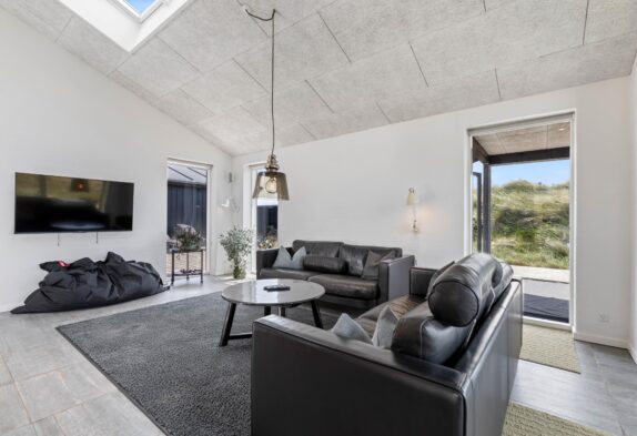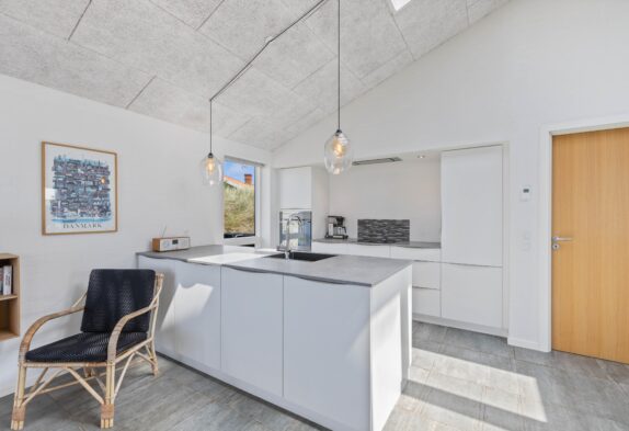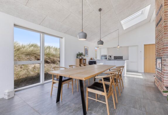 Feriehuset er overalt lyst og smagfuldt indrettet i hyggelig skandinavisk stil, med bl.a. gulvvarme og flotte grå klinkegulve.
