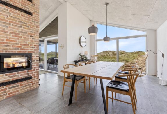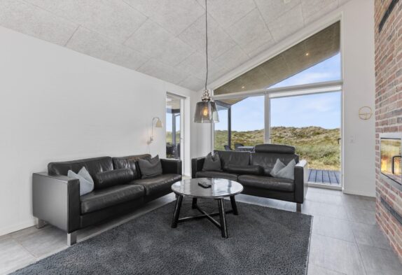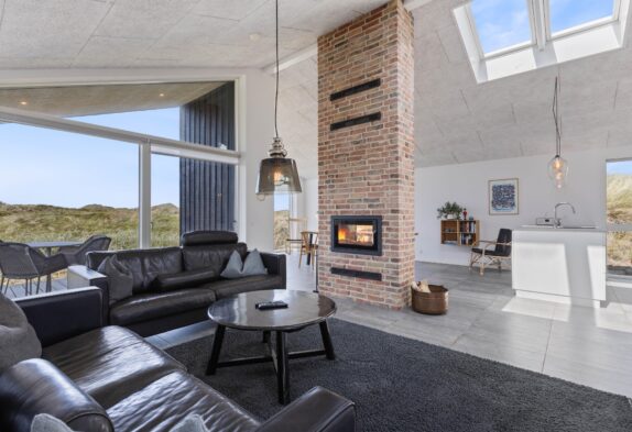 Køkkenafdelingen, som bl.a. er med opvaskemaskine, er rigtig praktisk indrettet, så man hele tiden er en del af selskabet i stuen. Opholdsrummet er gennemgående i sommerhuset og i midten delt af en flot muret skorsten, hvor brændeovnen kan nydes fra begge sider. I den ene side af rummet er der et sofa-hygge-hjørne med flotte og praktiske lædermøbler – i den anden side, i direkte forbindelses med køkkenafdelingen, er spiseafdelingen med flotte spisebordsmøbler, i skandinavisk stil. Overalt i det smukke opholdsrum er der panoramaudsigt til det betagende klitlandskab.