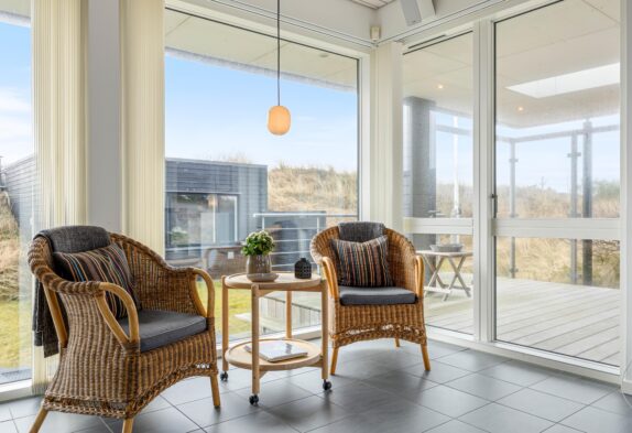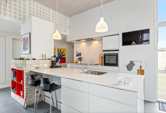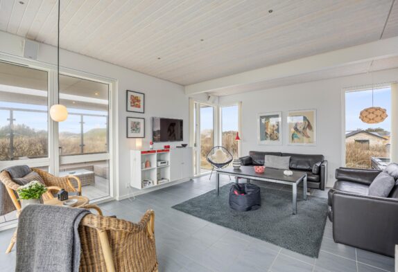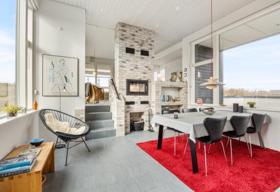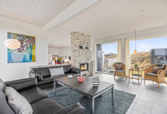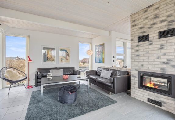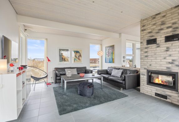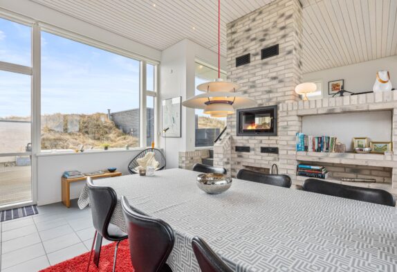 Selv om huset har stilrene linjer, er der stadig gjort plads til “hyggen”. De mange små detaljer gør indretningen personlig og skaber en hyggelig og afslappende ferieatmosfære, som I vil mærke med det samme. I stuen som ligger i forskudt plan med køkkenet, er der god plads til at I kan finde et hyggeligt og komfortabelt sted at slappe af. Her er der også en pejseindsats, der er perfekt til de køligere årstider, da den altid er garant for at sprede en masse hygge og ikke mindst varme. Fordi at husets også er udstyret med fibernet, kan I altid holde jer opdateret på det der sker på de sociale medier.
