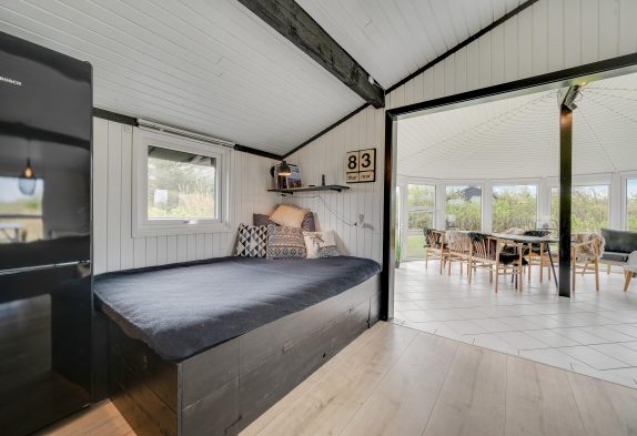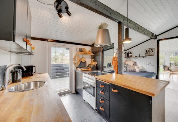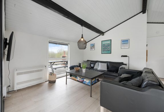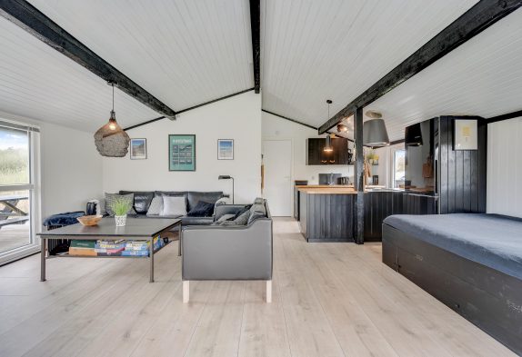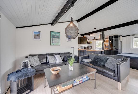 Husets hjerte er det sammenslåede køkken- og stuerum, hvor lyse farver, trælofterne og de flotte kontraster sætter stemningen. Stuen er bygget omkring store vinduespartier, som danner sin helt egen separate udestue med udsyn til den grønne have, og i køkkenalrummet er der flere hyggelige kroge, hvor I kan sætte jer til rette med en god bog og en friskbrygget kop kaffe.