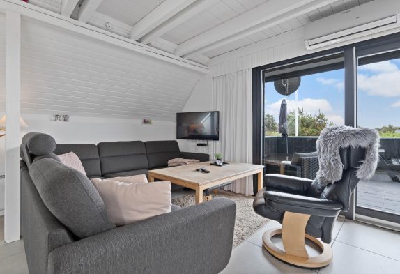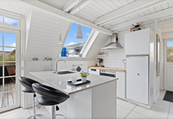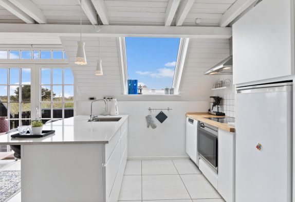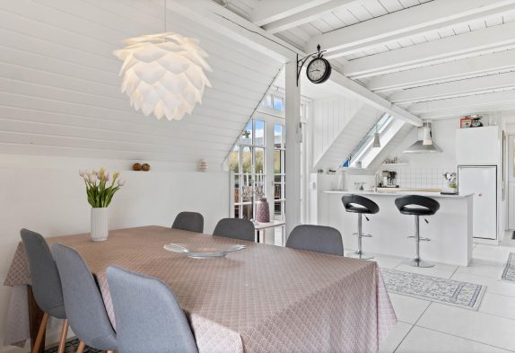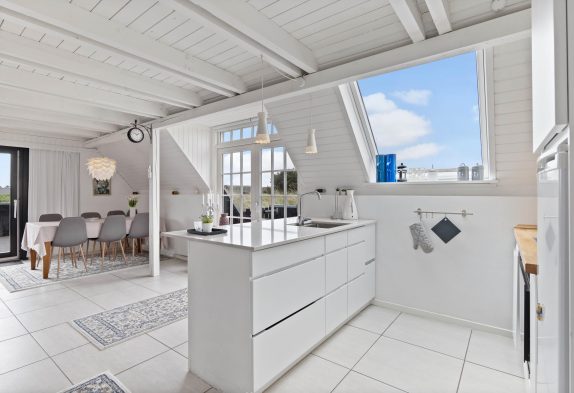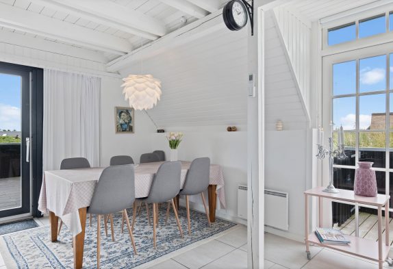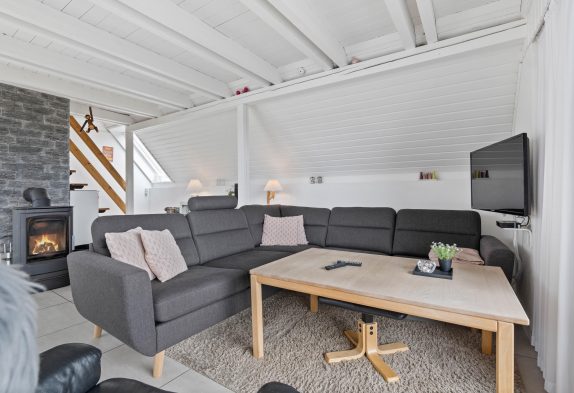 Det kombinerede køkkenal- og stuerum fungerer som husets hjerte, og brændeovnen i midten af rummet sørger for dejlig varme og en hyggelig ferieatmosfære med dens knitrende flammer hele året rundt. Hvis I dog ønsker en mere bæredygtig og økonomisk løsning til at varme huset op, så kan i også bruge husets varmepumpe, der kan sørge for et behagelig temperatur året rundt. De mange vinduer og de hvidmalede vægge- og lofter, sørger for et virkelig lyst og rart opholdsrum, hvor I virkelig kan have nogle hyggelige stunder.