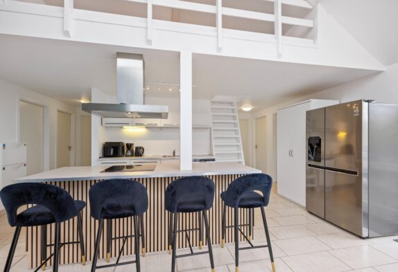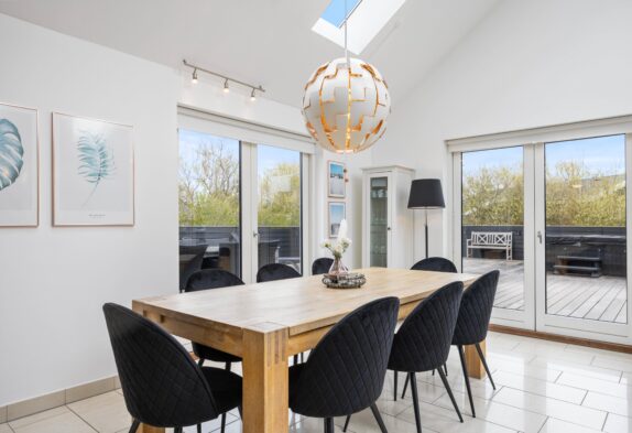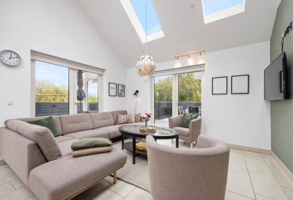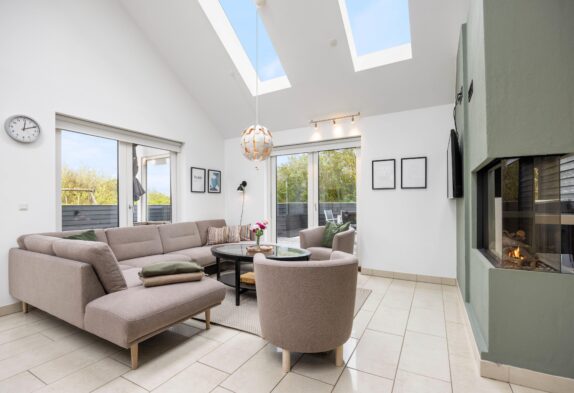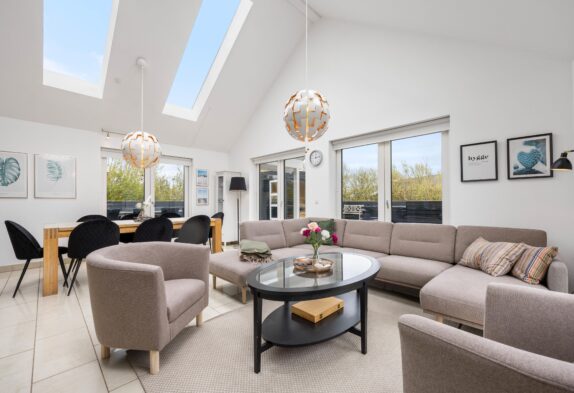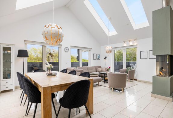 Køkken og stue er forbundet i ét stort fællesrum, hvor I kan bruge mange hyggelige timer sammen. Den flotte gasovn sørger for god varme selv på de køligste feriedage, og de store ovenlysvinduer lader solens lys trænge indenfor og åbner rummet endnu mere op.