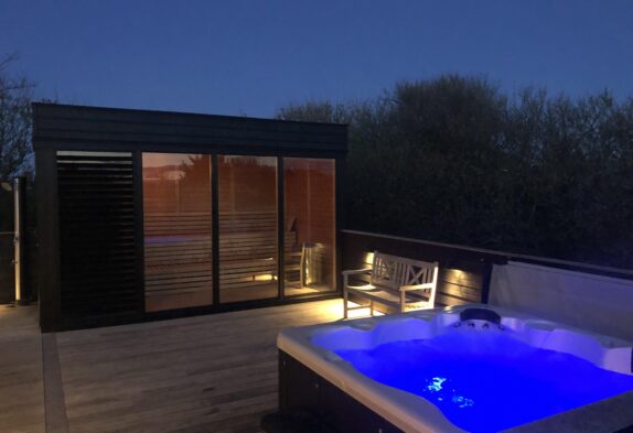Uforstyrrede udeomgivelser med udendørs spa, sauna og bruser