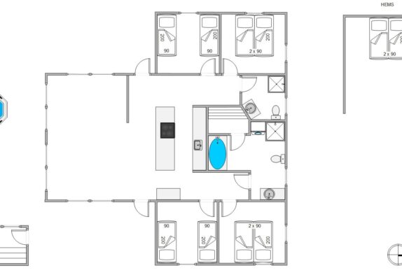 Ret praktisk er feriehuset indrettet med 2 badeværelser, gode faciliteter som opvaskemaskine og vaskemaskine, og på hemsen er der sørget for lidt ekstra underholdning til børnene i form af bordfodbold, og fjernsyn med spillekonsol.