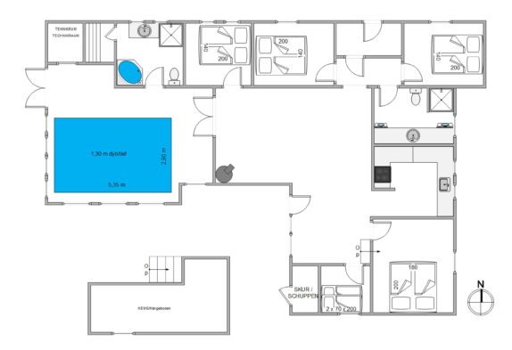 Huset råder over 2 badeværelser, hvoraf det ene er med spa og sauna – og ligger i pool afdelingen. Det andet badeværelse indeholder vaskemaskine og tørretumbler, hvilket gør det nemmere at pakke til alt slags vejr – og til enhver lejlighed. En varmepumpe i huset gør huset mere energivenligt – og hjælper med at holde omkostningerne på et passende niveau.