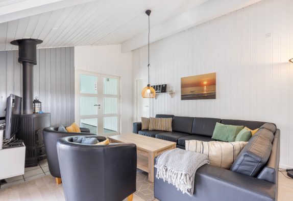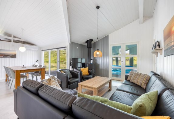 På de lidt koldere dage, indbyder stuen til afslapning foran brændeovnen – og herfra kan man også nemt følge børnenes leg i poolen eller på hemsen.