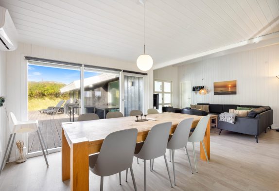 På terrasserne rundt om huset, kan man til enhver tid finde et læ-hjørne, og mod syd er terrassen omgivet af klitter, så man er helt privat og kan nyde solen og lugten af havet, mens børnene gynger eller leger i sandet.