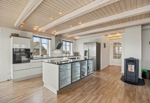 Fra den veludrustede køkkenafdeling med bl.a. amerikaner-køleskab, mikroovn, opvaskemaskine og 80 l. fryser er der åbent til ophold- og spisestue, hvilket gør det nemt at være en del af samværet der, selv når ”man står i køkkenet”.
