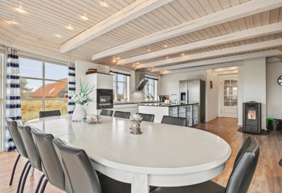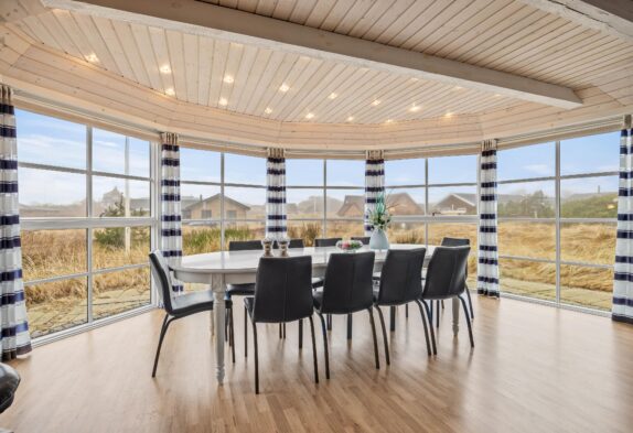 Sommerhuset er smagfuldt og lækkert indrettet i lys og skandinavisk stil. En karnap mod vest med et stort vinduesparti gør, at man føler, at man nærmest ”sidder midt ude i naturen”, når man sidder ved spisebordet. Det giver samtidigt et fantastisk lys ind i huset. Herfra kan man også se aftensolen og solnedgangen over klitterne.