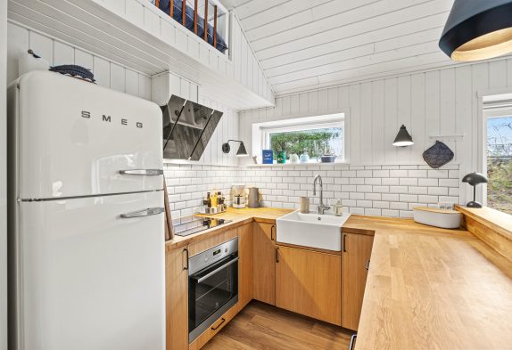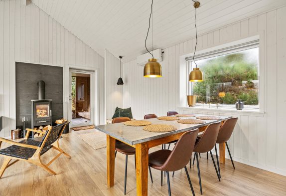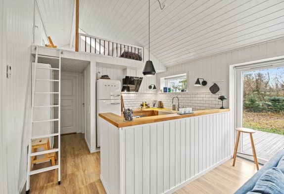 Det lækre feriehus i Henneby fortjener alle sine fem stjerner. Indretningen er moderne og velovervejet, og de hvide vægge og lofter, der går helt op i kip, åbner rummene op og skaber en imødekommende ferieatmosfære.