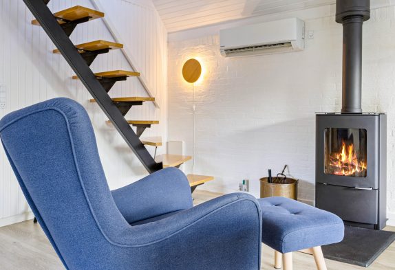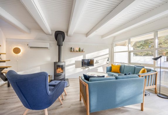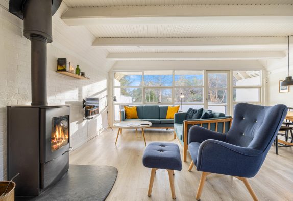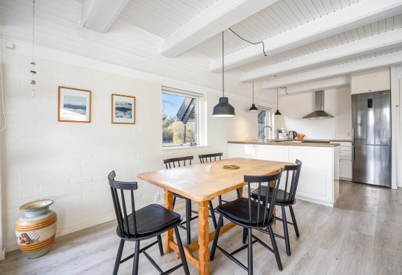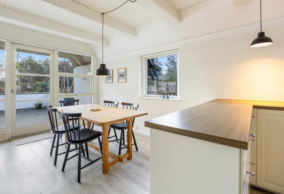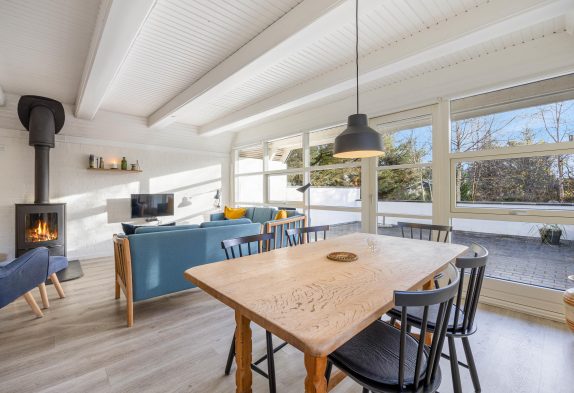 Det veludstyrede køkken er slået sammen med stuen, hvilket skaber et stort fællesrum med plads til afslapning og skønne feriestunder. Den klassiske brændeovn spreder varme og god stemning, så selv de mest barske efterårs- og vinterdage bliver utrolig hyggelige.