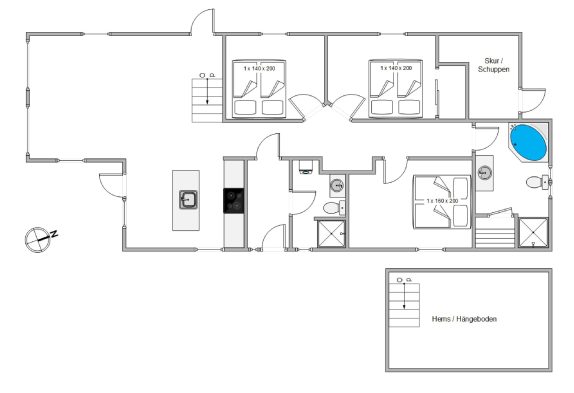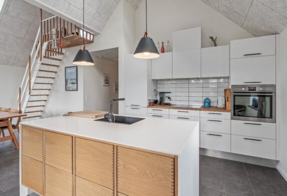 Det åbne samtalekøkken med siddemuligheden ved køkkenøen er perfekt til fælles hygge omkring madlavningen, også hvis man nøjes med at nyde et glas vin, kigge på og give gode råd til sovsetilberedningen. Imens hygger de unge eller børnene måske på hemsen, hvor der er god mulighed for at pakke legetøjet ud eller gemme sig lidt med sin computer og udnytte det gode fiberbredbånd. Børnefamilien vil sikkert glædes over højstol og muligheden for at kunne vaske og tørre tøj i husets vaskemaskine og tumbler.