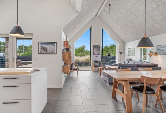 Marehalmen danser i vinden og lyngen sender sin duft ind over husets terrasse fra den store smukke klitgrund. Her på den store afskærmede terrasse med de gode møbler kan I sidde i læ og nyde udsigten. Når så solen begynder at farve himlen rød mod vest, kan I søge ind på det overdækkede areal og nyde de sidste solstråler imens grillen bliver varm og klar til tilberedelsen af et lækkert aftensmåltid.