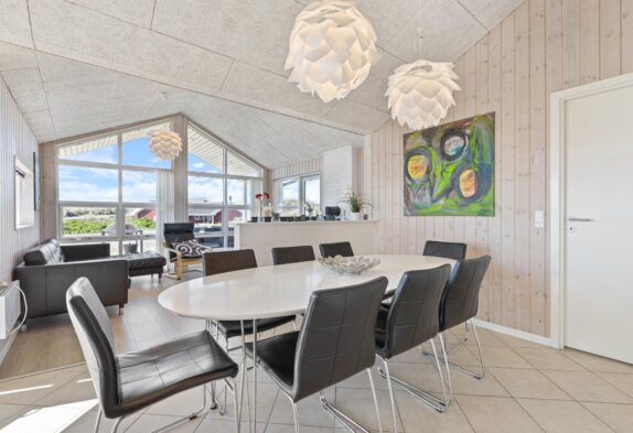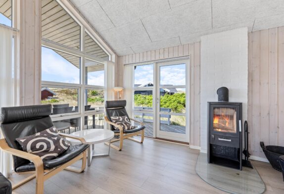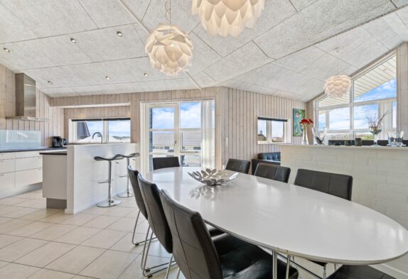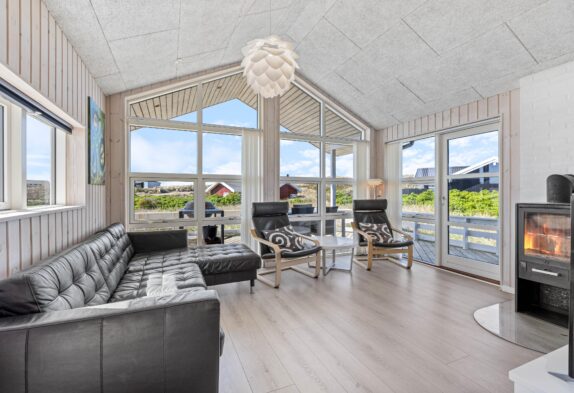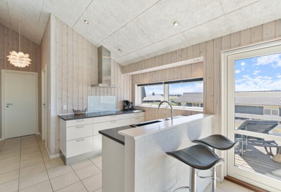 Det skønne feriehus på Julianevej 43 byder på 120 velindrettede kvadratmeter; lyse farver er et gennemgående tema i hele huset, og de store vinduespartier i stue og køkken inviterer solens stråler og Bjerregårds smukke klitlandskab indenfor.