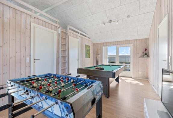 Der er sørget for underholdning for alle aldre i feriehjemmet. I det største af husets 2 badeværelser er der lagt op til afslappende wellnessoplevelser i sauna og spabad, og i aktivitetsrummet kan de konkurrenceglade familiemedlemmer give sig i kast med bordfodbold og billard.