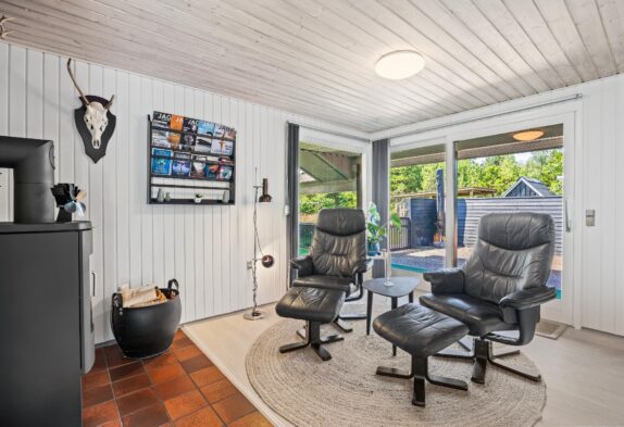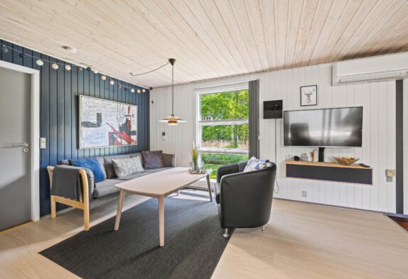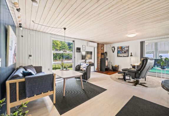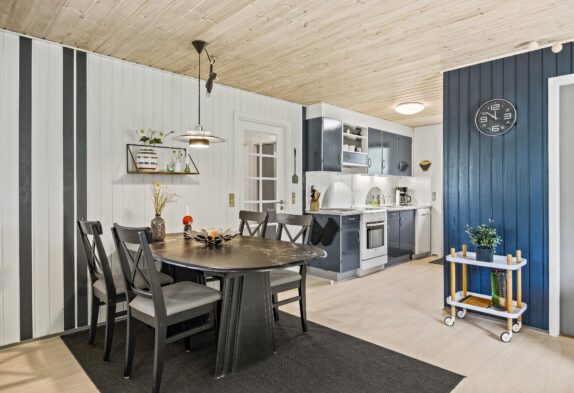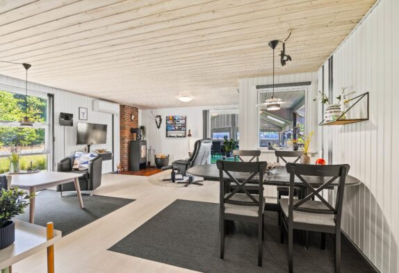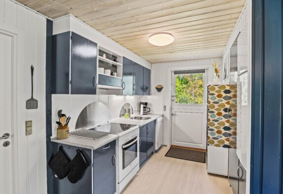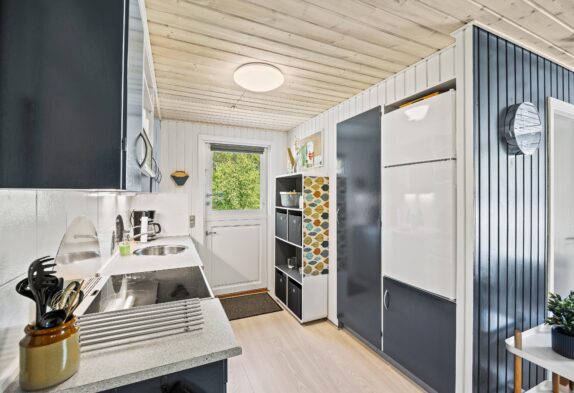 Velkommen indenfor på Hedevang. Du vil her blive mødt af et funktionelt køkken i åben forbindelse til stuen. I køkkenet er der installeret en opvaskemaskine, så I som familie kan lade maskinen arbejde, og selv komme ned i gear og ikke tænke over opvasken. I vil i huset med det samme kunne mærke sommerhusstemningen, med de lyse vægge og den skandinaviske stil. Lænestolene står klar foran brændeovnen og tv’et, til I kommer hjem fra en dejlig gåtur i det fantastiske område, som I finder i Houstrup.