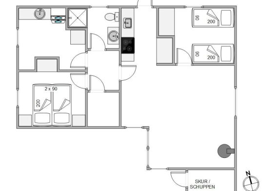 Feriehuset er opført med 2 soverum med god skabsplads, og et flot renoveret badeværelse med gulvvarme. I vil også nyde godt af den store dejlige bryggers med gulvvarme, hvor der også er installeret en vaskesøjle.