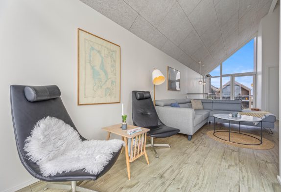 Ferielejligheden er udstyret med 2 badeværelser med gulvvarme, så I slipper for lange toiletkøer og kolde fødder om morgenen. Med en hurtig og stabil internetforbindelse kan I alle være online på ferien og streame film på de medbragte iPad’s og computere. Her er desuden placeret 2 gode lænestole, i en dejlig hyggekrog med udsigt udover fjorden. Her kan man læne sig tilbage og nyde ferieroen sænke sig.