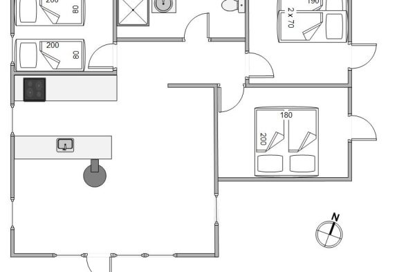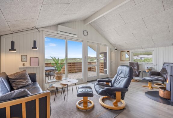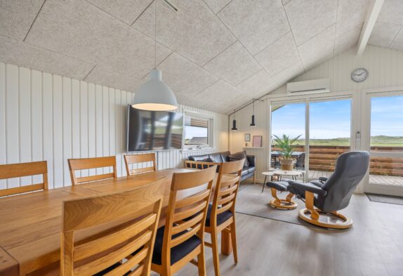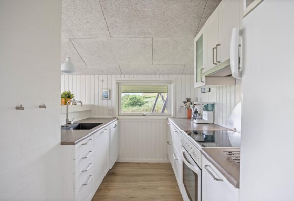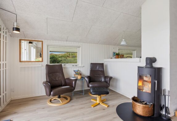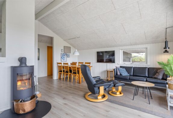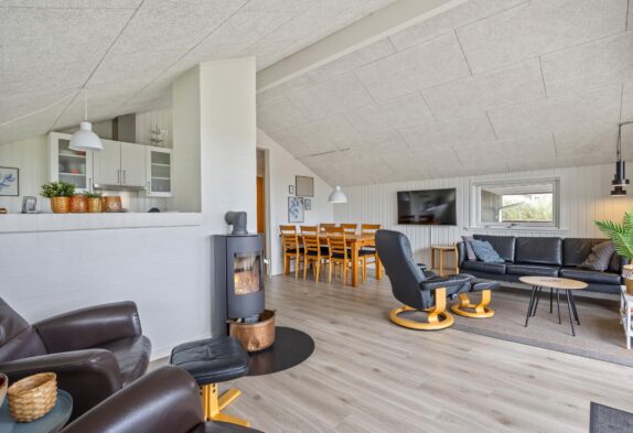 Hjerterummet, hvor I sammen kan tilbringe mange hyggelige timer, er det åbne køkkenalrum. Her kan I være sammen, selvom I har gang i forskellige ting. Mens børnene tegner omkring spisebordet, laves der mad i køkkenet, der naturligvis er udstyret med opvaskemaskine. Opvaskemaskinen klarer den kedelige oprydning, mens I spiller eller hygger i sofaen. Fra sofaen kan I streame jeres yndlingsfilm via. feriehusets Chromecast, mens brændeovnen knitrer i baggrunden på de køligere aftner. Udover brændeovnen er der i øvrigt også en energibesparende luft til luft varmepumpe.
