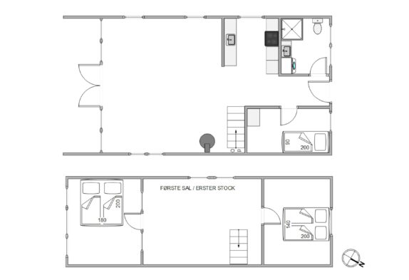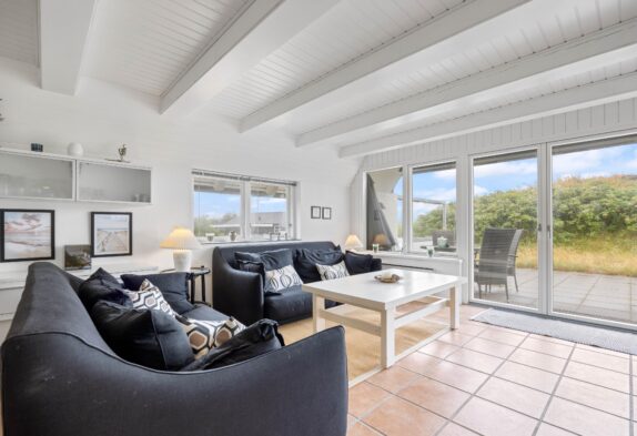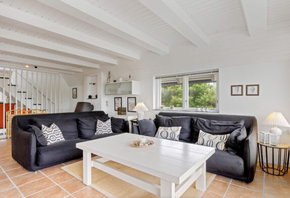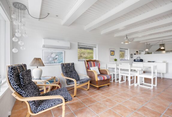 Sommerhusets hjerte er opholdsrummet på nederste etage, som kombinerer stue og køkkenalrum i ét og samme rum. Her står også brændeovnen, som sørger for god stemning og dejlig varme hele året rundt med sine knitrende flammer. Her kan I sidde og slappe af og lade tankerne flyve mens I lader batterier nu til endnu en spændende feriedag. Fra opholdsstuen har I direkte udgang til terrassen udenfor og de store vinduespartier tillader en masse lys at slippe ind i boligen. Der er også en ekstra stue ovenpå.
