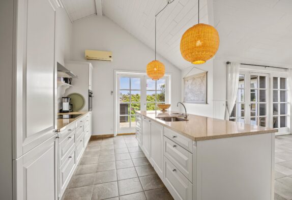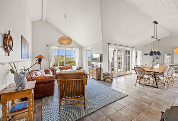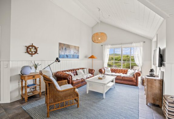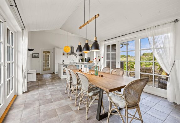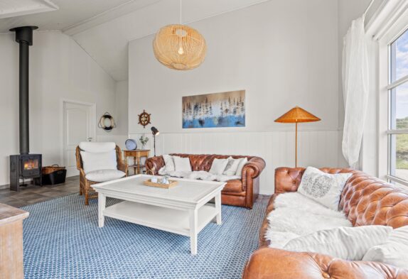 Sommerhuset på Nordvej 90 B råder over hele 140 kvadratmeter og er et ideelt valg til en familieferie ved vandet. Husets indre er prydet med lyse farver, store vinduespartier og høje lofter, hvilket får feriehjemmet til at virke endnu mere rummeligt og åbent.