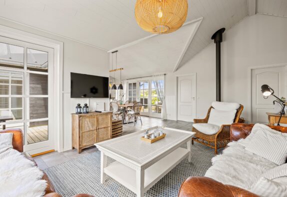 I det store opholdsrum står brændeovnen, som sørger for dejlig varme på de kølige årstider, og de knitrende flammer fylder rummet med god ferieatmosfære. Køkkenet er udstyret med opvaskemaskine og godt med service, så I kan slippe jeres indre kok løs og kreere de lækreste feriemåltider.