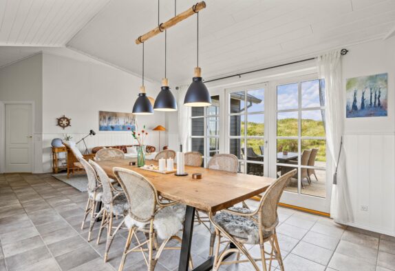 Kun 300 meter fra det brusende Vesterhav finder I dette store sommerhus til 8 personer. I vil hurtigt falde til i den lyse og venlige indretning med højt til loftet og lækre wellnessfaciliteter, og på den store terrasse finder alle feriegæster nemt en plads i solen.