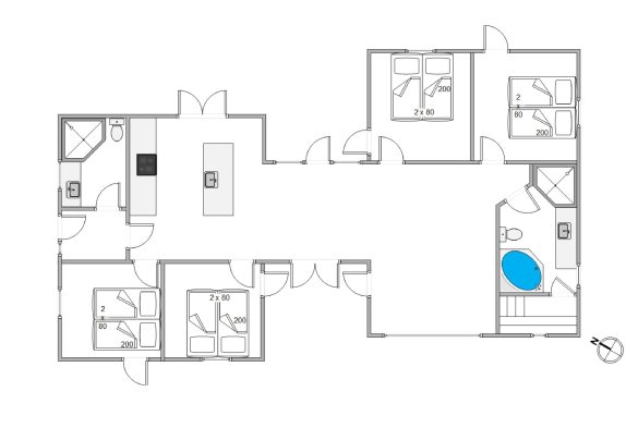 Huset er indrettet med 2 badeværelser (med gulvvarme), og på det største badeværelse får I jeres helt egen lille wellnessoase med sauna og spabad. Få varmen efter en forfriskende gåtur langs vandet eller rund en dejlig feriedag af med en afslappende wellness-session – så bliver det ikke bedre!