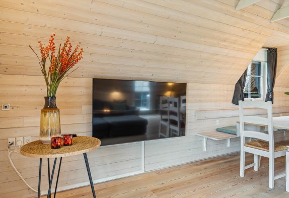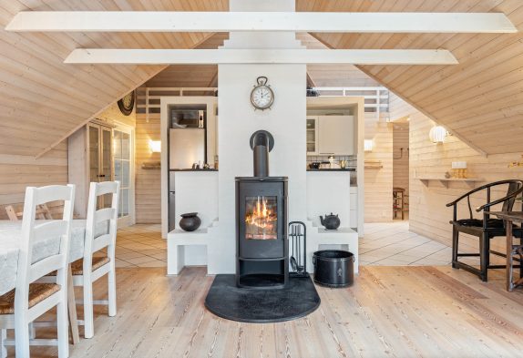 Den energibesparende varmepumpe sørger for, at I uden for store omkostninger altid har et behageligt klima i huset. Og ellers er brændeovnen selvfølgelig også en kilde til både varme og feriestemning med sine knitrende flammer.
