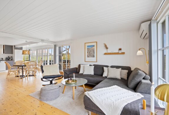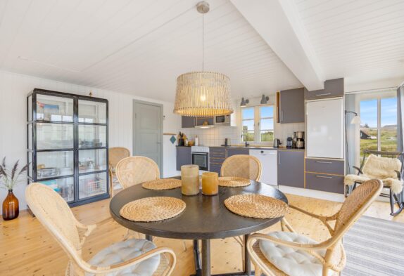 Husets hjerte er det store opholdsrum, som binder køkkenet, spiseområdet og stuen sammen. I køkkenet er der god plads til at lave mad sammen, og gennem det store vinduesparti falder der et flot lys ind i opholdsrummet. Ved det runde spisebord kan I samles til lækre feriemiddage eller brætspilsaftner.