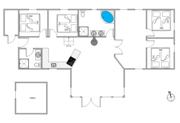 De fire soveværelser er alle udstyret med dobbeltsenge, og de to badeværelser er forsynet med gulvvarme, hvoraf det ene også har en herlig tømmespa – perfekt til afslapning efter en dag fyldt med lokale oplevelser.